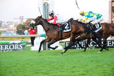 Johan’s horse Doosra, again ridden by Gavin Lerena, winning the Graham Beck Stakes, a 1400m for 3yo colts and geldings.